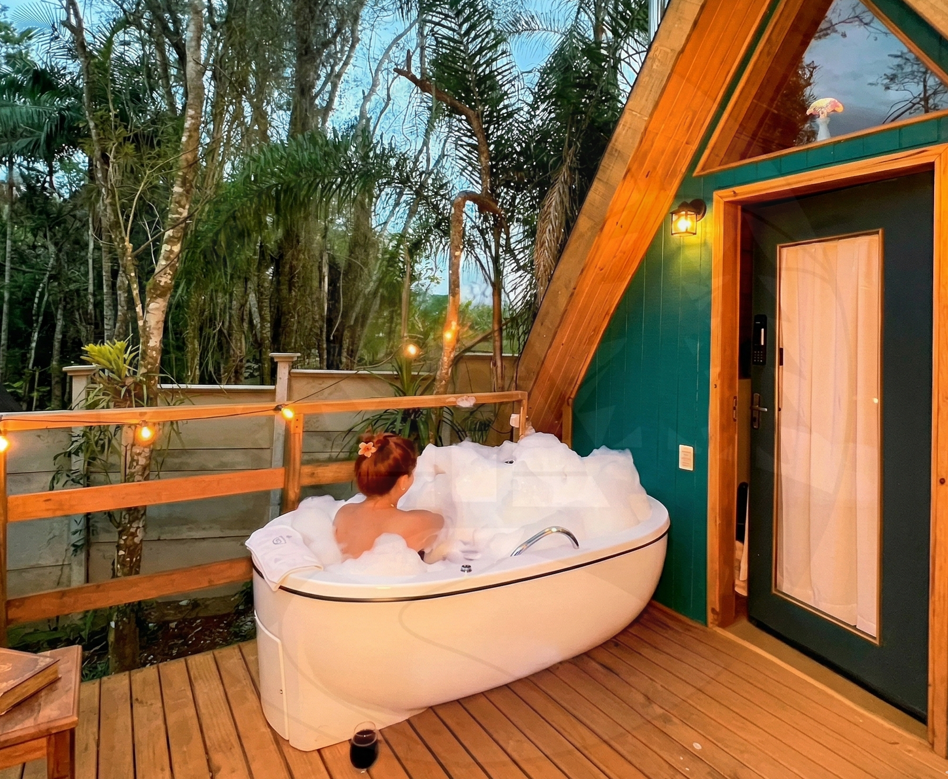 A varanda com uma banheira de imersão para 2 pessoas, te convida para momentos de relaxamento, descontração, enquanto a vista envolvente da mata e o contato com animais silvestres proporcionam uma experiência única de imersão na natureza.